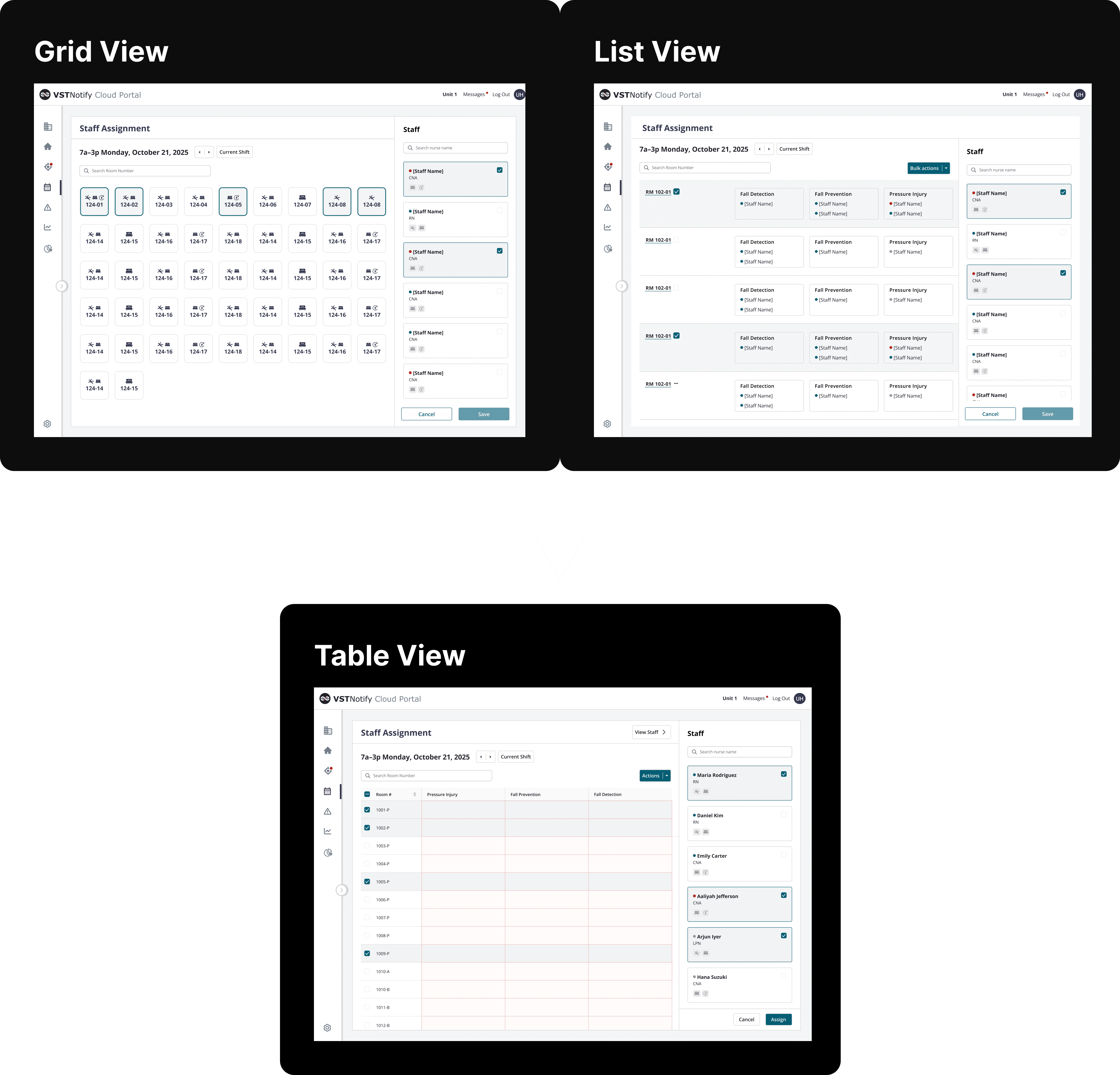 Manager (Charge nurses/nurse managers) assign staff to rooms during the shift, and alerts automatically route based on these assignments. Mid-shift updates can be made directly from the staff view, enabling quick reassignment without navigating to the room view.