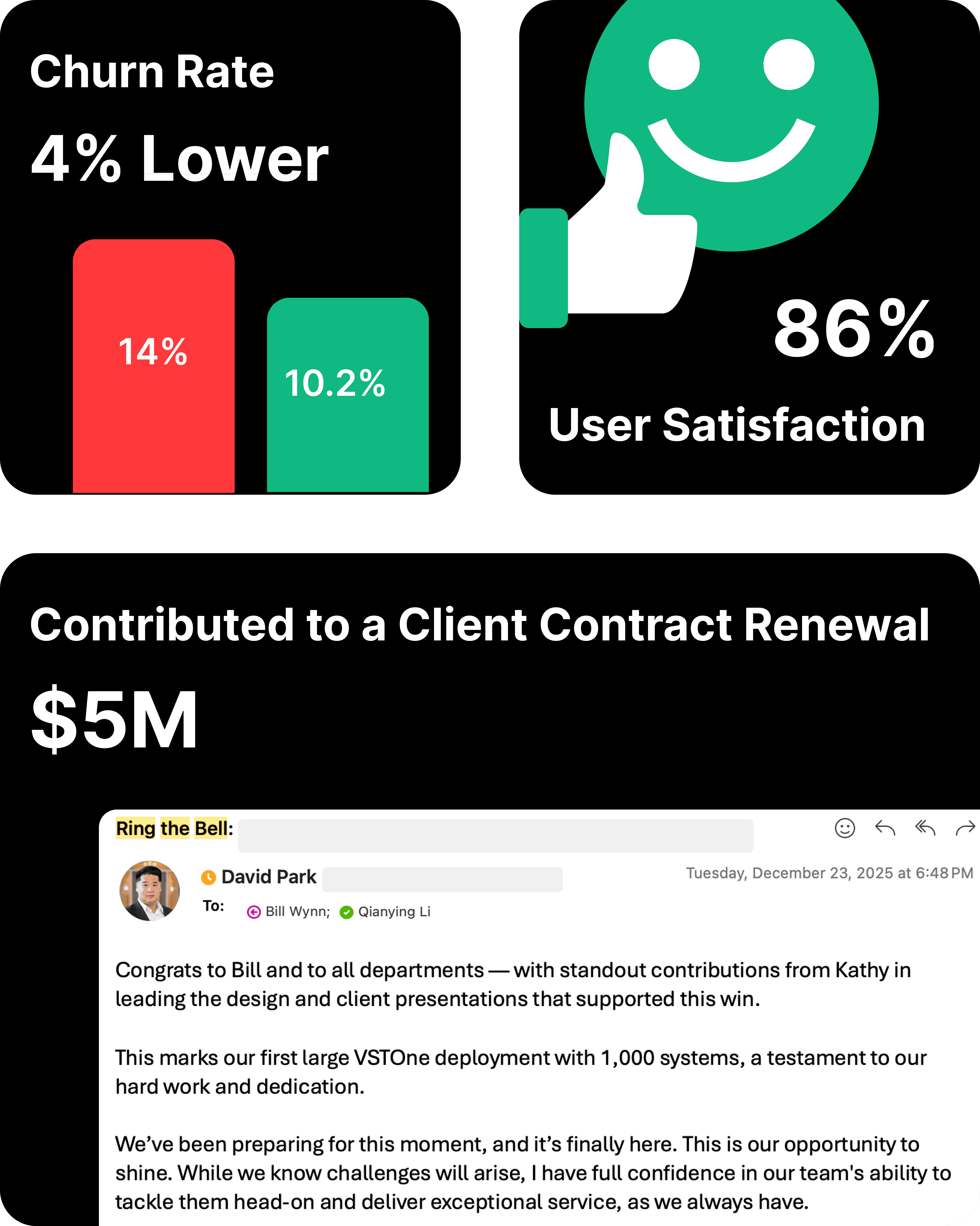 After the redesign, churn rate reduced by about 5% in early 2026. A follow-up survey showed a 15% increase in user satisfaction compared to Q1 2025.