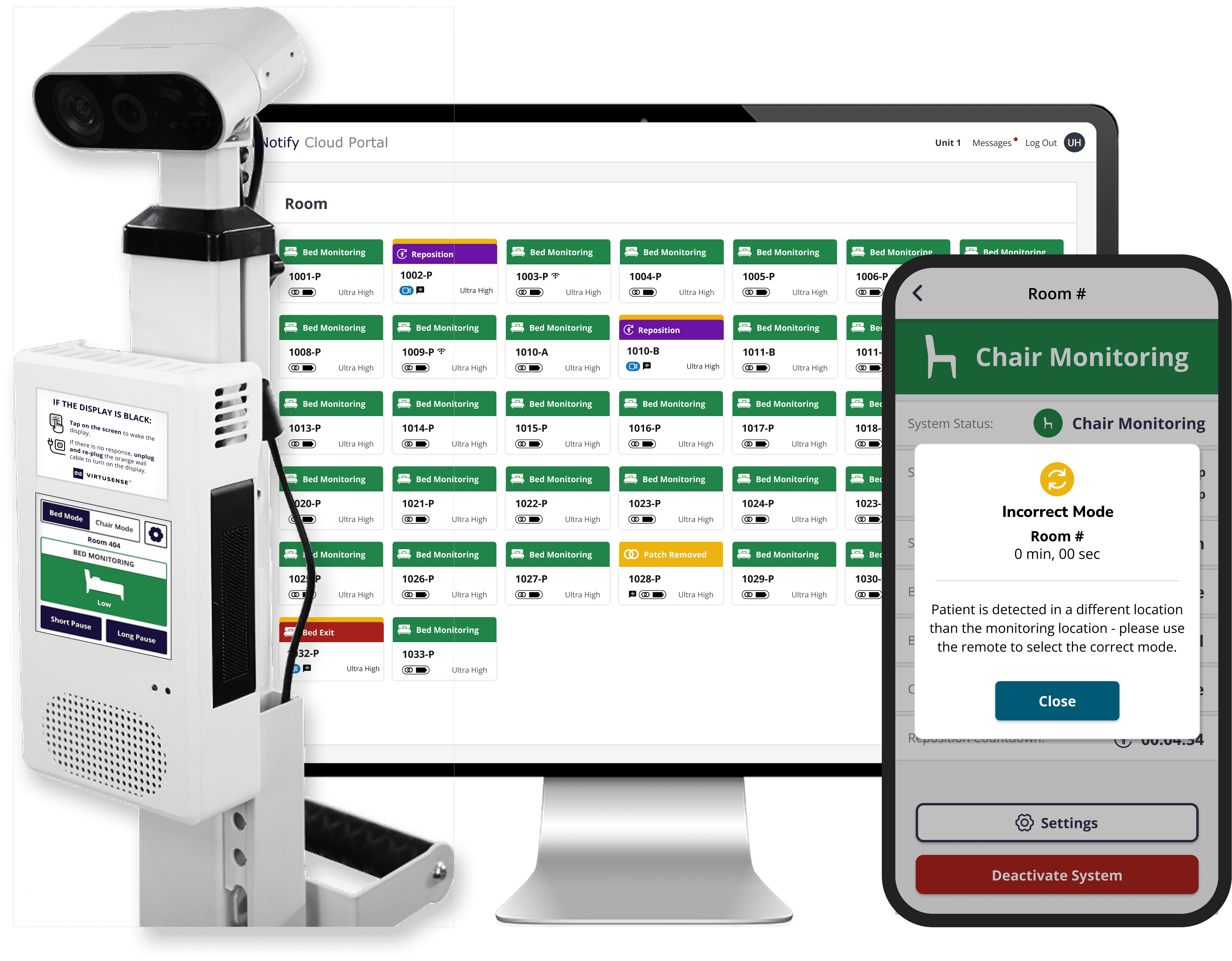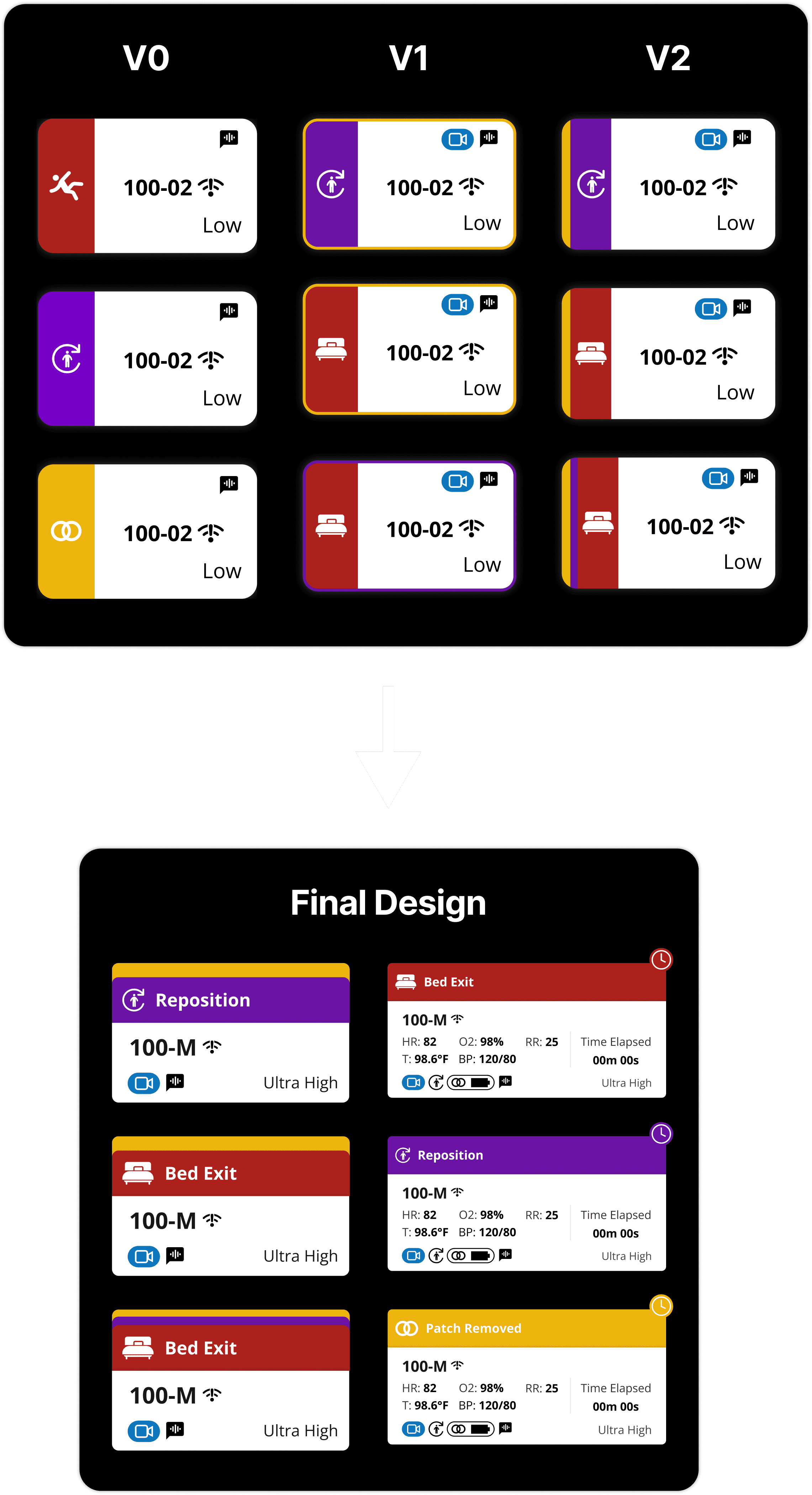 When multiple alerts fire at once, nurses need to know at a glance: which room needs me right now? The original tiles didn't answer that question.