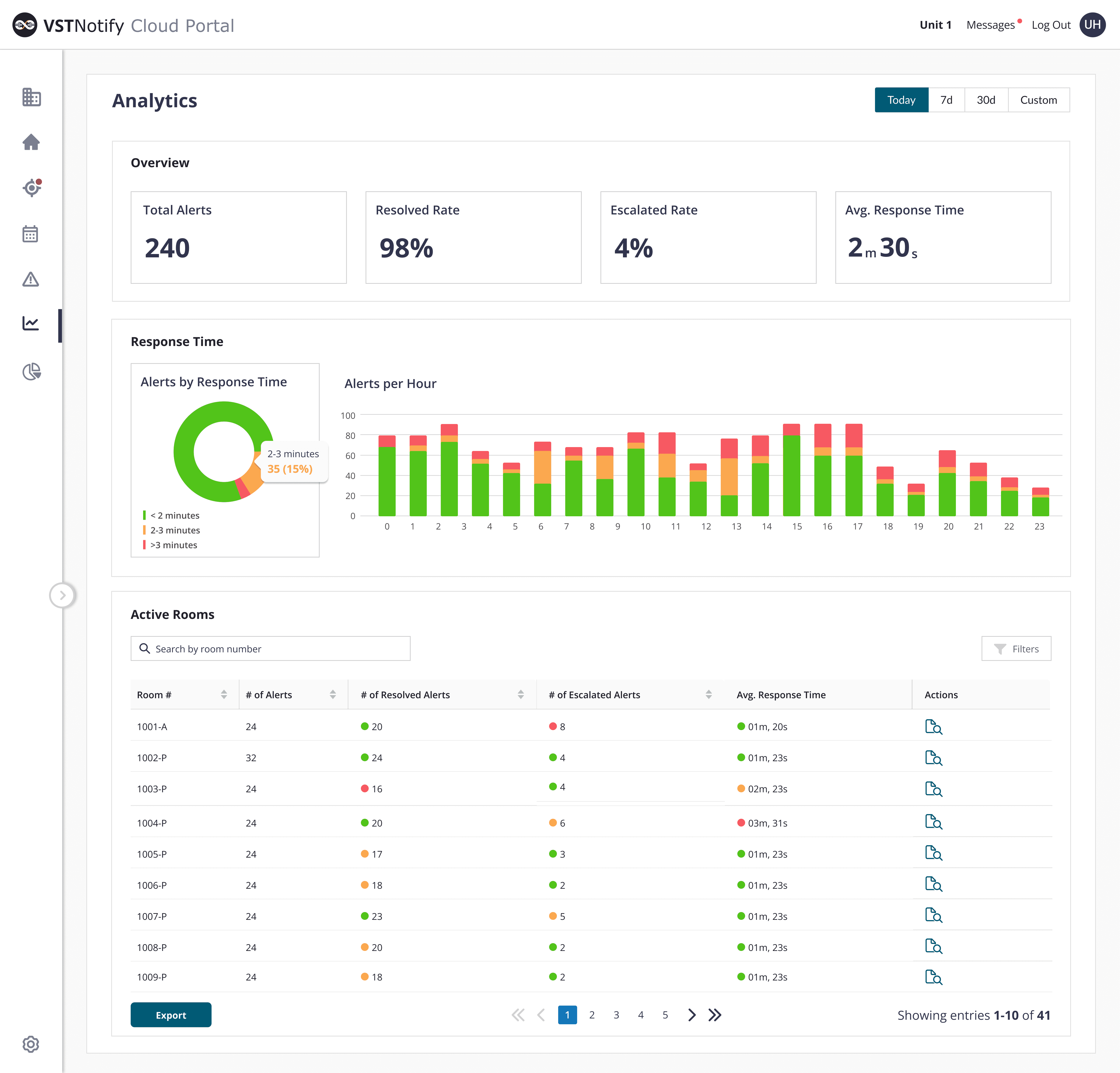 A centralized feed provides visibility into rooms with active alerts, along with a clear activity log. Unresolved alerts are automatically surfaced to the top over time, helping staff stay focused on higher-priority items.